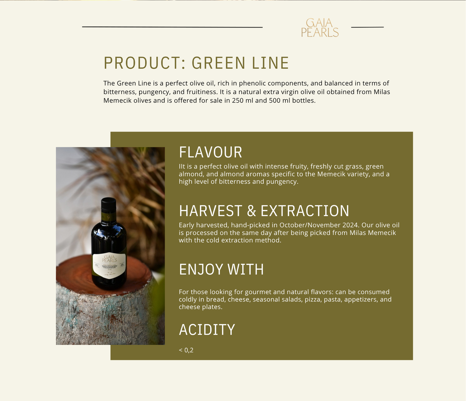 Gaia Pearls fabrikasında, 25 yılı aşkın mühendislik tecrübesiyle üretilen, Milas'ın Avrupa Birliği Coğrafi İşaretli (PDO) Memecik zeytinlerinden elde edilen erken hasat zeytinyağıdır. Monovarietal olarak üretilmiştir, blend değildir.